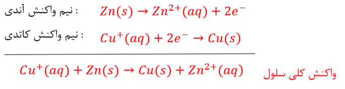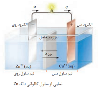 از اتصال دو نیم سلول مطابق شکل روبرو، الکترولیت های آن ها توسطیک دیواره ی متخلخل از هم جدا شده اند، یک سلول گالوانی تشکیل می شود. در یکی زا نیم سلول ها نی مواکنش اکسایش و درنیم سلول دیگر نیم واکنش کاهش انجام می شود.