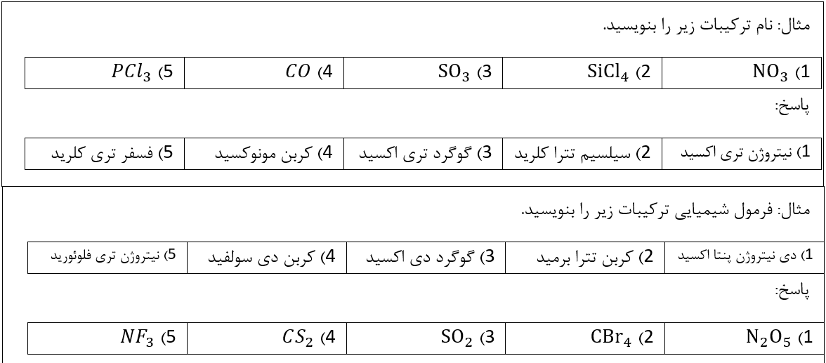 توجه: در فرمول مولکولی، اتمی كه سمت چپ نوشته میشود (به جز اتم هیدروژن) ، اتم مركزی است و اتم های دیگر با یك، دو یا سه پیوند اشتراکی به آن متصل میشوند.