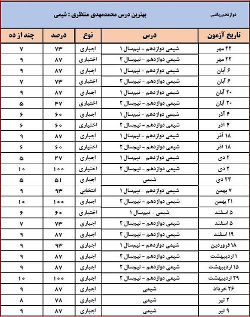 علاوه بر کارنامهی آزمون، هر 2-3 آزمون یکبار از کارنامهی پنج نوع درس استفاده میکنم، چرا که روند درسی، نقاط ضعف و قوت را به من نشان داده تا به کمک آن برنامه ریزی دقیق و کارآمد تری انجام دهم.