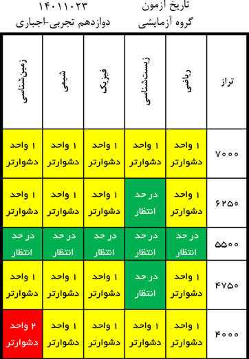 در این جدول برای هر درس رنگ های متفاوتی را می بینید .ممکن است یک درس برای یک بازه ی تراز دشوار و برای بازه ی تراز دیگر متعادل یا ساده باشد . ابتدا نمره ی تراز خود را در نظر بگیرید و سپس رنگ های هر درس را در بازه ی تراز خود ببینید . متوجه می شوید که آیا آن درس برای شما ساده تر از حد انتظار یا دشوارتر بوده یا این که متعادل بوده است .