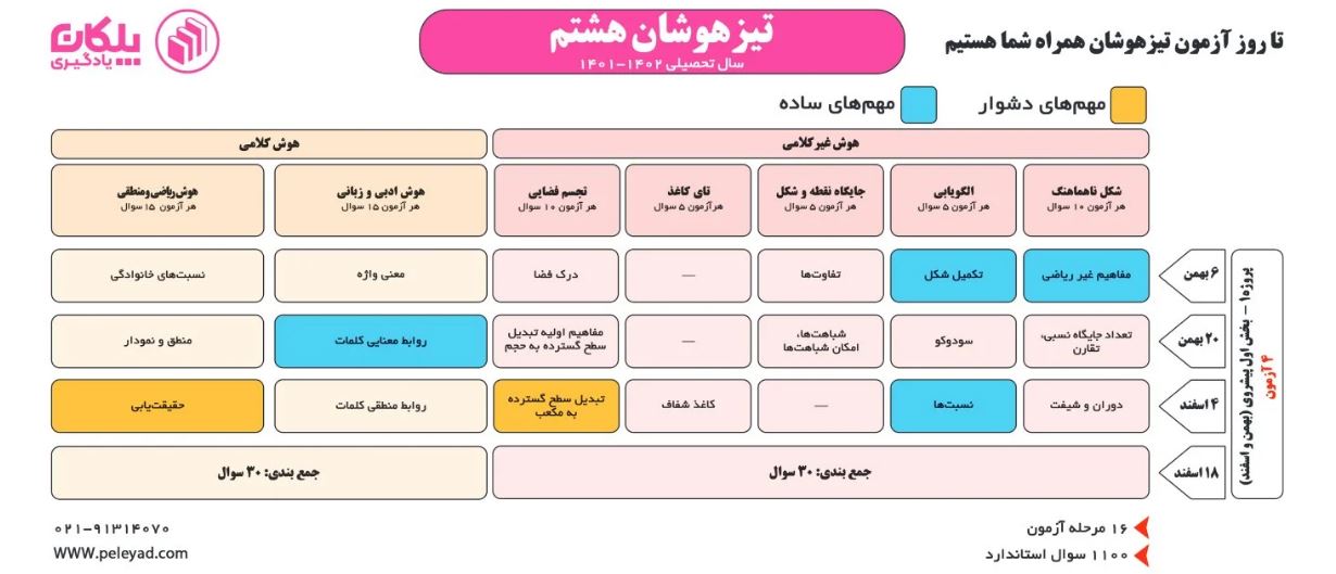 پکیج هوش پلکان 1403 برای دانش آموزان هشتم و نهم: دانش آموزان هشتم و نهم می توانند برنامه زیر را که در سال 1402 برای تیزهوشانی ها تدارک دیده شده بود را مطالعه کنند و همچنین می توانند برنامه هوش 1403 پلکان یادگیری را با کلیک بر روی آزمون آمادگی تیزهوشان مشاهده نموده و در آزمون شرکت نمایند.
