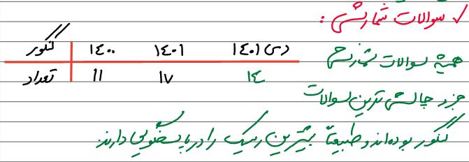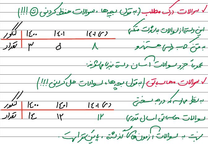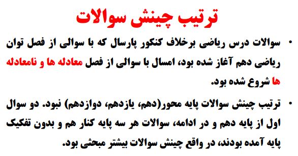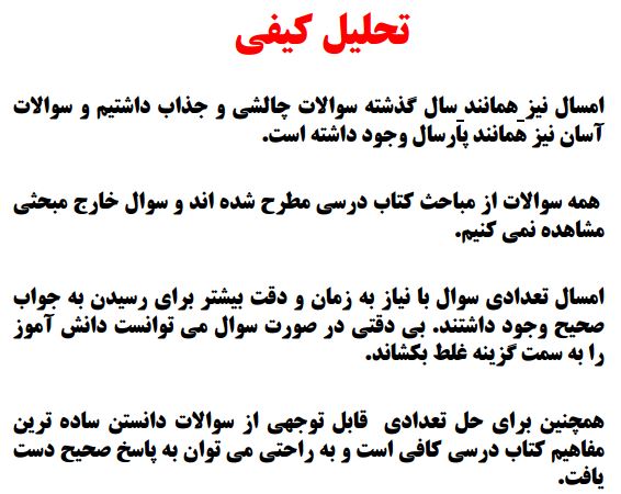 ● با توجه به حجم کم سؤالها تعداد 3 سؤال تقریباً در سالهای قبل آمده بود و به خوبی میشد با مطالعه کنکورهای گذشته این سؤالها را پاسخ داد.