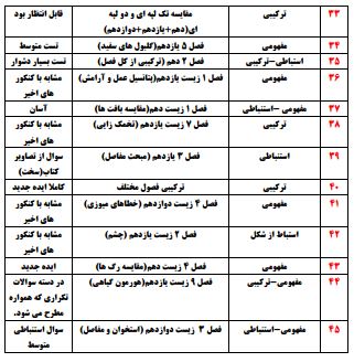 ● سال گذشته یک ترکیب ناهمگون در فصلهای مختلف وجود داشت که امسال تقریباً اکثر فصلها 2 سؤال دارند و فصل آخر 1 سؤال که این هم عجیب بود که چرا فصل 7 که معمولا تعداد سؤال زیادتری داشت
