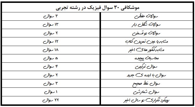 اگر سوالات را به سه دسته متنی،مفهومی و محاسباتی طبقه بندی کنیم مطابق جدول زیر 80 درصد سوالات محاسباتی بودند و سهم سوالات متنی و مفهومی تغییر چندانی نسبت به سال های گذشته نداشت.
