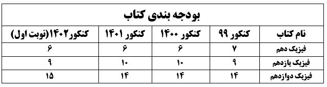 در آزمون امسال در مقایسه با دو سال گذشته سهم کتاب یازدهم یک سوال کمتر و سهم کتاب دوازدهم یک سوال بیشتر شده است.به عبارت دیگر مطابق جدول زیر نیمی از سوالات از کتاب دوازدهم مطرح ده است ضمن آنکه یک سوال از بخش الکتریسیته ساکن ترکیبی با مبحث دینامیک مطرح شده بود.