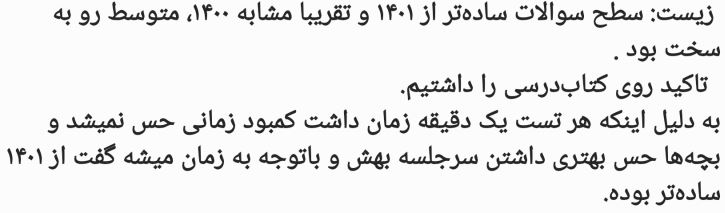 نظر کلی:آزمون امروز آزمون بسیار خوبی هم از نظر سطح آزمون و هم از نظر پوشش مباحث بود و تمام سوالات کاملا مبتنی بر محتوای کتاب درسی طرح شده بودند.اگر بخواهیم سطح آزمون را با کنکورهای گذشته مقایسه کنیم در بخش سوالات دوازدهم و همچنین فصل جریان الکتریکی سطح سوالات بالاتر از کنکورهای گذشته بودند برای مثال در مبحث حرکت بر خط راست تمام سوالات مفهومی بودند و دواطلب برای پاسخ به سوالات این بخش بایستی به طور کامل بر این فصل مسلط باشد اما در بخش های دیگر سوالات پایه سطح سوالات مشابه کنکور 1401 بود.
