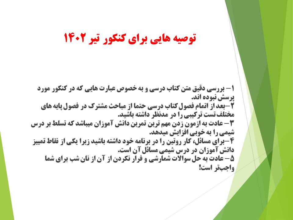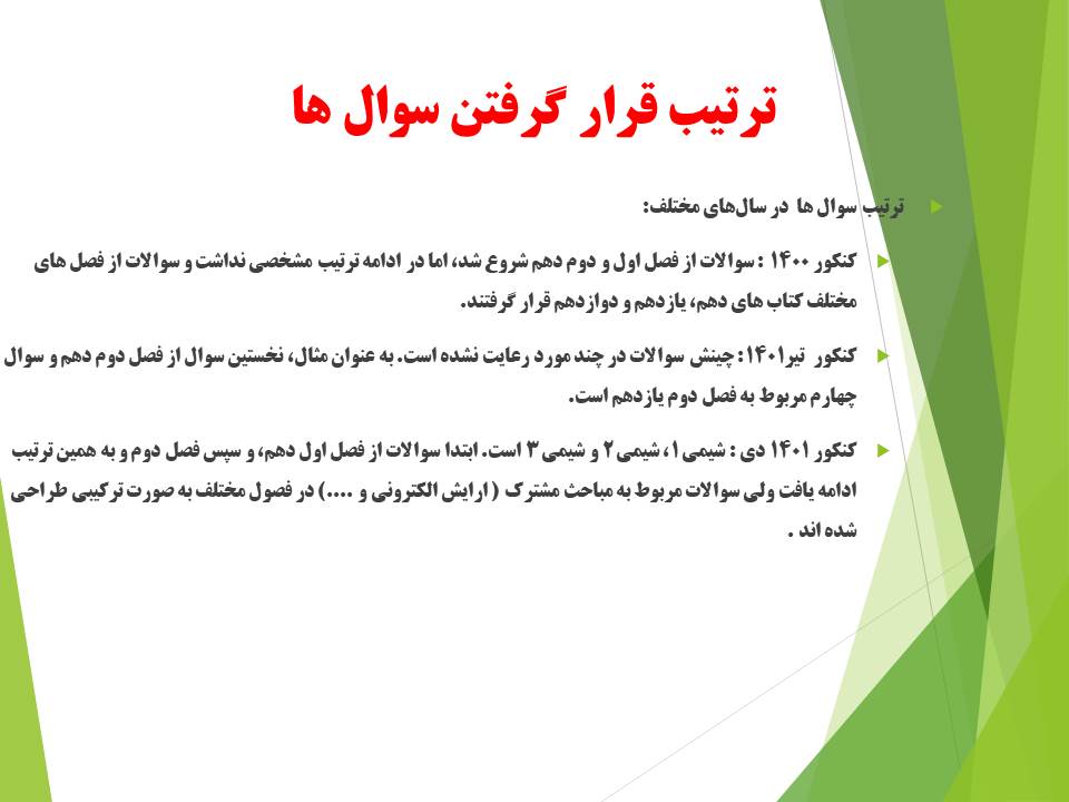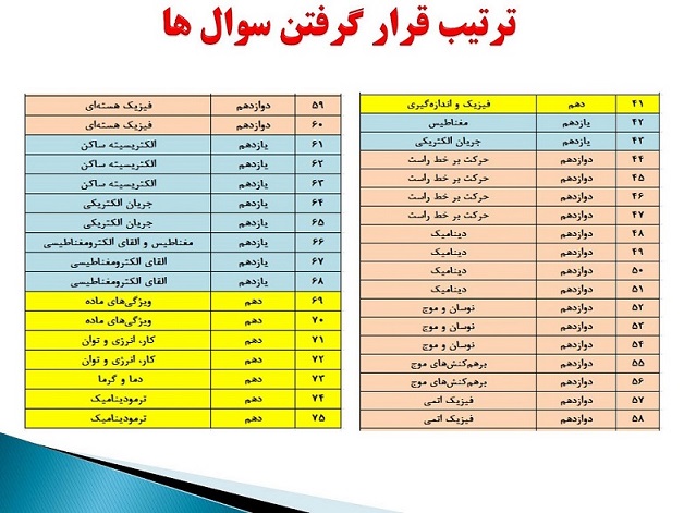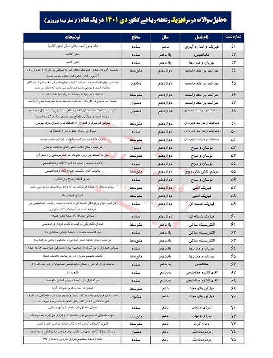 - از نگاه دیگر، درمجموع ۱۶ سؤال از ۴۰ سوال از مباحث دوازدهم بود که میتوانست کمی بیشتر باشد ولی بهنظر بنده قابل دفاع و تا حدودی مناسب است.