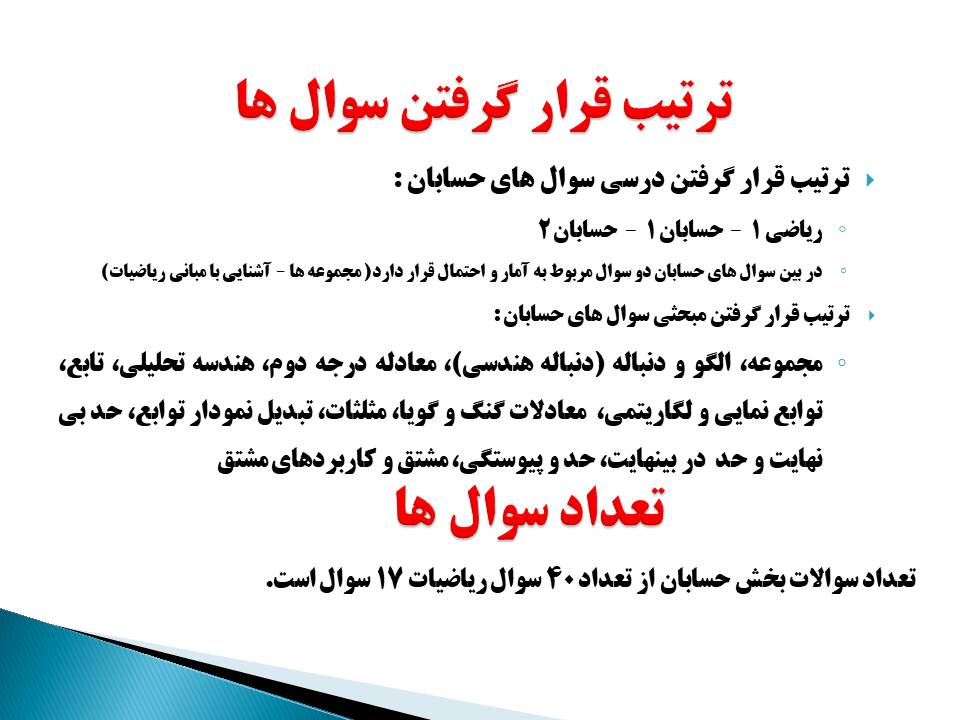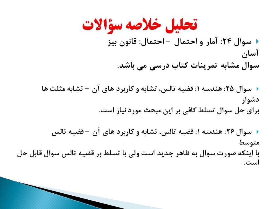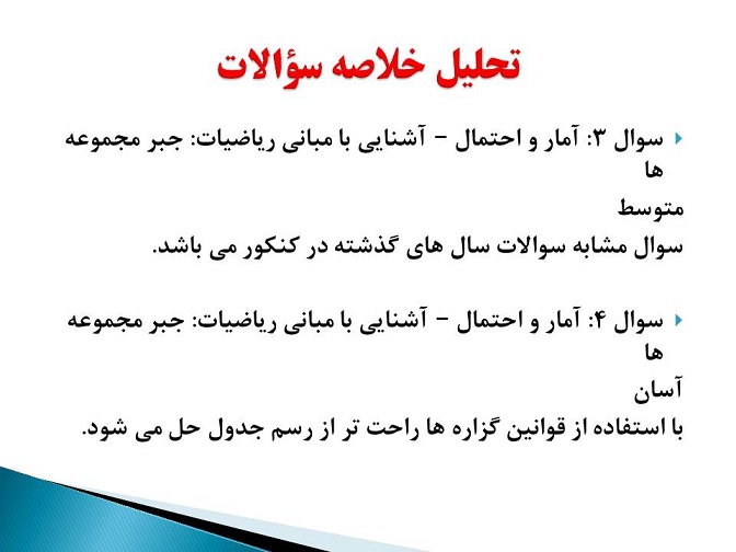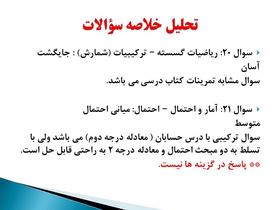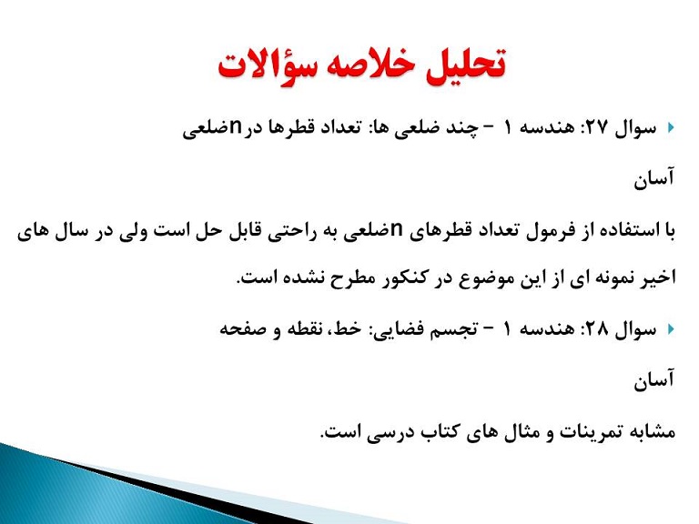 - مطلب آخر اینکه به جز کنکور۱۴۰۰ در کنکور های سراسری در درس ریاضی، معمولاً سؤالات ترکیبی از موضوعات کاملاً متفاوت دیده نمیشد ولی در این آزمون چند بار این اتفاق افتاد که این مطلب هم در نوع خود مهم و قابل ذکر است.