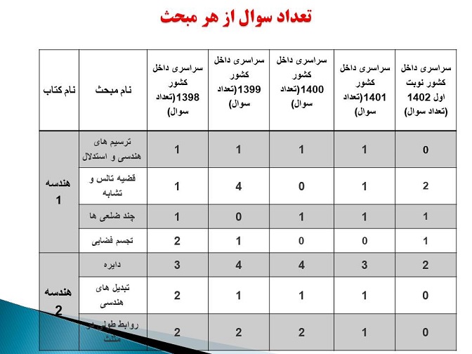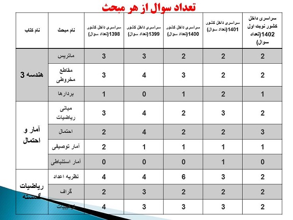 - در این آزمون سهم حسابان و ریاضیات پایه مربوطهاش ۱۷ سؤال بود که سهم حسابان ۲ ، ۶ و سهم ریاضیات پایه ۱۱ بود. سهم هندسه پایه ۶ سؤال و هندسه ۳، ۵ سؤال که در مجموع سهم هندسه ۱۱ سؤال شد. سهم گسسته 5 سؤال و آمار و احتمال و شمارش بدون شمردن، 7 سؤال که سهم گسسته ، آمار و احتمال و شمارش 12 سؤال شد.