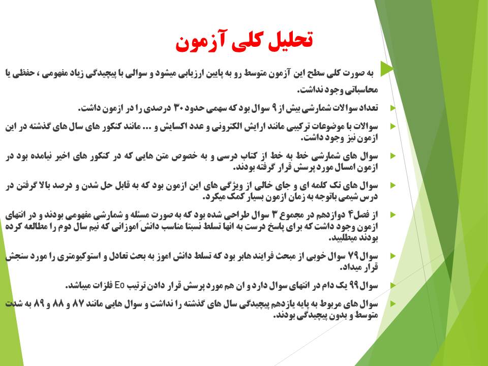 - ادبیات سؤالها، کاملاً ادبیات روانی بود و به جهت سطح علمی، سؤالات در چهارچوب کتابهای درسی قابل دفاع بودند. به خصوص اینکه چند سؤال با طراحی خوب و تحسین برانگیز در آزمون دیده میشد.