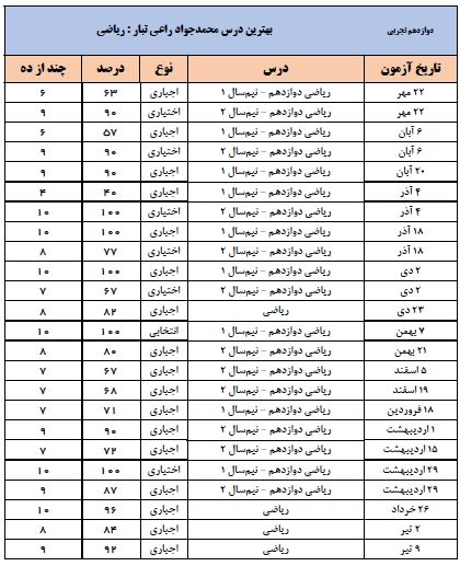 واریانس زیادی در نتایج درس هایم وجود ندارد، تقریبا همه را در سطح خوبی پاسخ میدهم، اما اول به دیدن نتایج شیمی می روم تا ببینم روشی که برای آن به کار بردم مؤثر بوده است با نه! در مورد ایرادات همانطور که گفتم بعد از بررسی وتحلیل آزمون از تیپ تست هایی که غلط زدم یا یادگیریام ناقص بوده، تمرین و تست بیشتری در برنامه ام قرار میدهم.