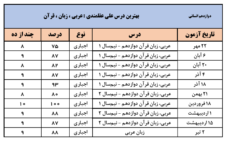 عربی(90%-80%) : از نظر من در درس عربی با تکنیک و روش خاصی نمی شود به نتیجه رسید بلکه باید بر مباحث پایه (حتی دروس متوسطه اول) تسلط کامل داشت چرا که دروس عربی کاملا به هم پیوسته هستند و حذف کردن یا مشکل در یک درس بر کل مطالب تاثیرگذار است. برای مطالعه هم، اول کتاب درسی را به صورت کامل میخوانم، متون را تجزیه و ترکیب میکنم، قواعد را کار میکنم و سپس تست میزنم. همچنین مطالعه ی روزانه و مستمر عربی هم به تسلط بیشتر کمک میکند.