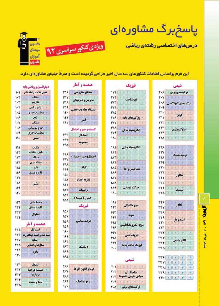آنگاه بر آن شدیم تا چیدمان مباحث مختلفی را که در کنکور از آن سؤال مطرح میشود شناسایی کرده و در قالب یک پاسخبرگ مشاورهای ارائه کنیم تا شما بتوانید با تمرین 3روز یکبار به کمک این پاسخبرگ مشاورهای، مسیر خود را با آرامش طی کنید.