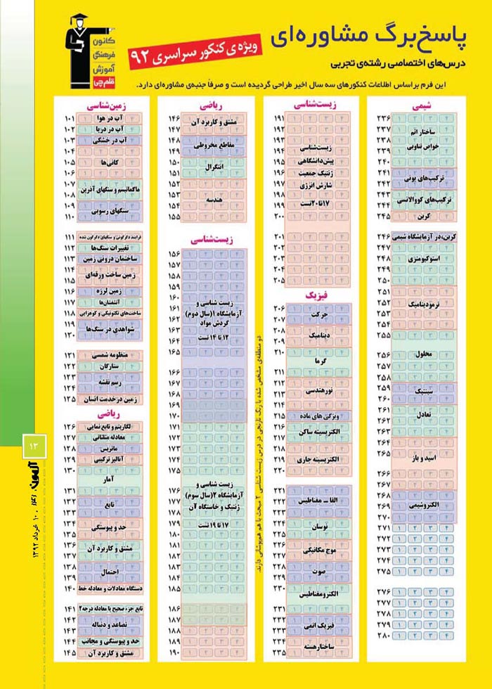 آن‌گاه بر آن شدیم تا چیدمان مباحث مختلفی را که در کنکور از آن سؤال مطرح می‌شود شناسایی کرده و در قالب یک پاسخ‌برگ مشاوره‌ای ارائه کنیم تا شما بتوانید با تمرین 3روز یک‌بار به کمک این پاسخ‌برگ مشاوره‌ای، مسیر خود را با آرامش طی کنید.