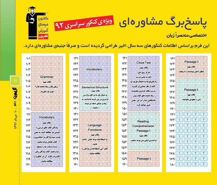 آن‌گاه بر آن شدیم تا چیدمان مباحث مختلفی را که در کنکور از آن سؤال مطرح می‌شود شناسایی کرده و در قالب یک پاسخ‌برگ مشاوره‌ای ارائه کنیم تا شما بتوانید با تمرین 3روز یک‌بار به کمک این پاسخ‌برگ مشاوره‌ای، مسیر خود را با آرامش طی کنید.