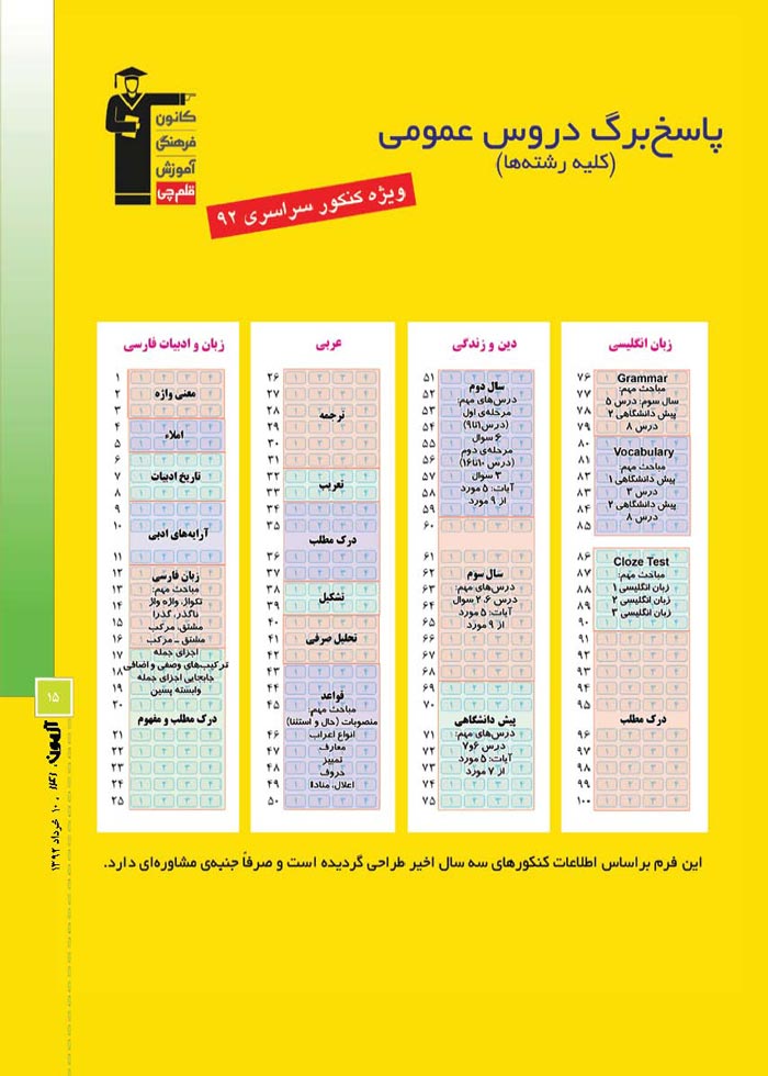 آن‌گاه بر آن شدیم تا چیدمان مباحث مختلفی را که در کنکور از آن سؤال مطرح می‌شود شناسایی کرده و در قالب یک پاسخ‌برگ مشاوره‌ای ارائه کنیم تا شما بتوانید با تمرین 3روز یک‌بار به کمک این پاسخ‌برگ مشاوره‌ای، مسیر خود را با آرامش طی کنید.