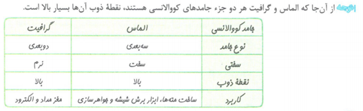 * الماس دارای چینش سه بعدی اتم های کربن و گرافیت دو بعدی و لایه ای است.
