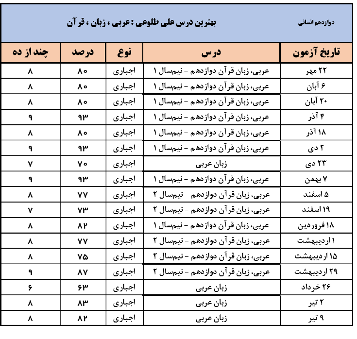 بیشترین درسهایی که در آن پیشرفت داشتم دروس عربی و روانشناسی بوده که در روانشناسی تلاش کردم بیشتر به مفهوم برسم و تستهای بیشتری را کار کنم.