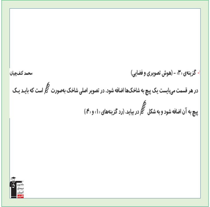 دانش آموزان عزیز سلامدر این بخش دو نمونه سوال هوش تصویری و فضایی به همراه پاسخ تشریحی جهت آمادگی در آزمون برای شما بارگزاری شده است. سوالات رو اول خودتون حل کنید بعد جوابا رو بررسی کنید . موفق باشید.
