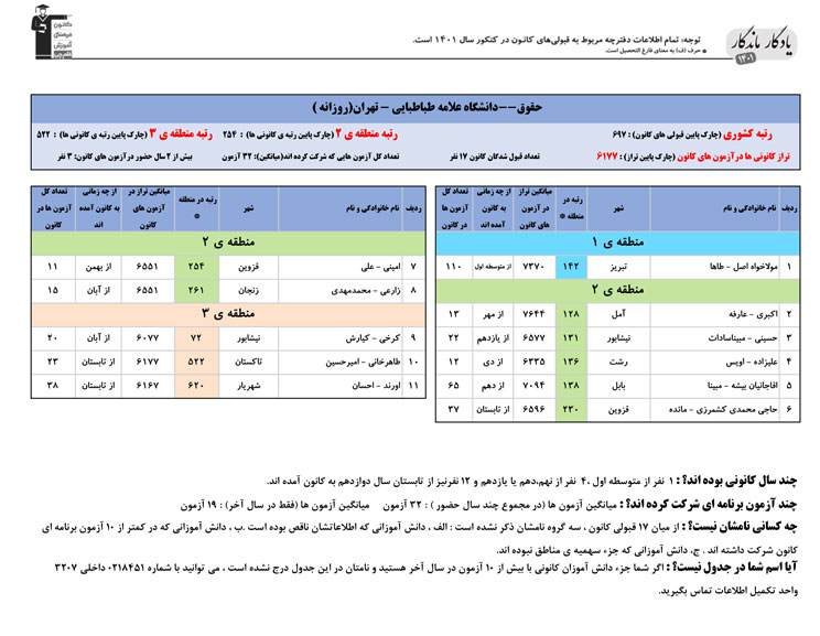 یادگار ماندگار : قبولی های کانونی دانشگاه علامه طباطبایی تهران در همه رشته ها در سال 1401 را در ادامه مشاهده کنید.فایل با کیفیت قبولی های سال 1401 را در قسمت فایل های ضمیمه دانلود کنید.
