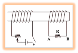درشکل روبه رو با حرکت لغزنده رئوستا ،جریان سیملوله سمت چپ تغییر میکند، با تغییر جریان در سیملوله سمت چپ،میدان مغناطیسی درون سیملوله تغییر کرده و به تبع آن شار مغناطیسی گذرنده از سیملوله سمت راست تغییر میکند. طبق قانون فارادی یک نیرو محرکه القایی در سیملوله سمت راست ایجاد می شود.