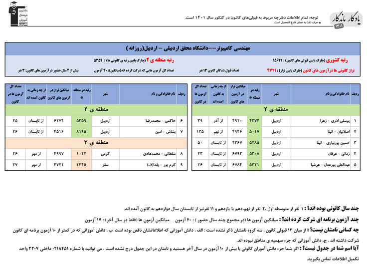 یادگار ماندگار : قبولی های کانونی دانشگاه محقق اردبيلي اردبيل در همه رشته ها در سال 1401 را در ادامه مشاهده کنید.فایل با کیفیت قبولی های سال 1401 را در قسمت فایل های ضمیمه دانلود کنید.