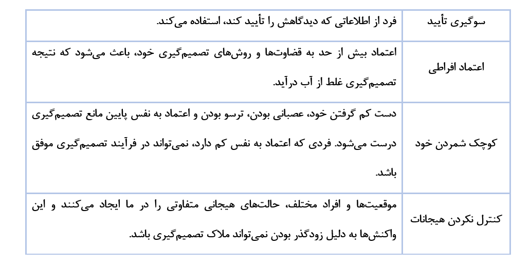 موانع تصمیمگیری : به برخی روشها اشاره میکند که غلط هستند و مراحل تصمیمگیری را تحت تأثیر قرار میدهند و تصمیمگیری کارآمد و مفید را مختل میکند.