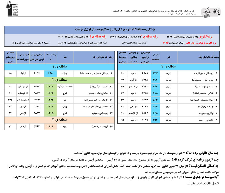 یادگار ماندگار : قبولی های کانونی دانشگاه علوم پزشکي البرز - کرج در همه رشته ها در سال 1401 را در ادامه مشاهده کنید.فایل با کیفیت قبولی های سال 1401 را در قسمت فایل های ضمیمه دانلود کنید.