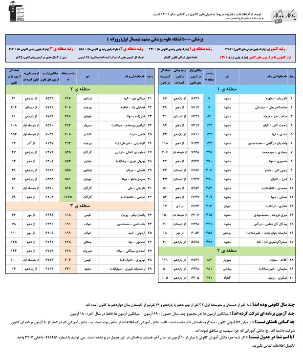 یادگار ماندگار : قبولی های کانونی دانشگاه علوم پزشکی مشهد در همه رشته ها در سال 1402 را در ادامه مشاهده کنید.