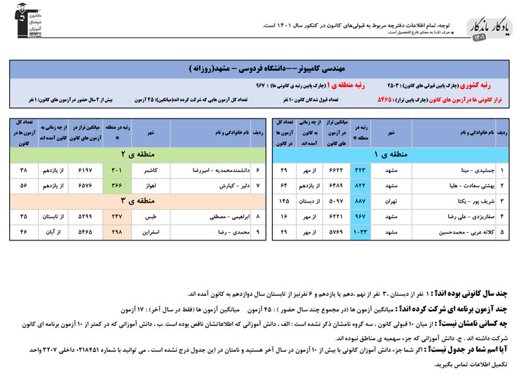 یادگار ماندگار : قبولی های کانونی دانشگاه فردوسی مشهد در همه رشته ها در سال 1401 را در ادامه مشاهده کنید.فایل با کیفیت قبولی های سال 1401 را در قسمت فایل های ضمیمه دانلود کنید.