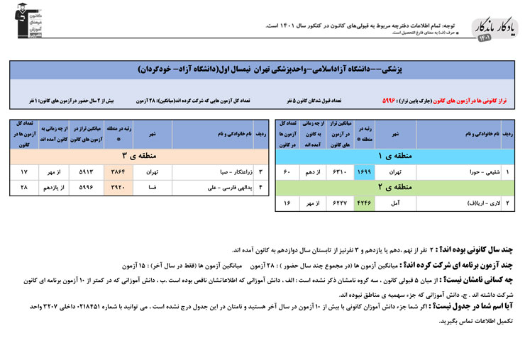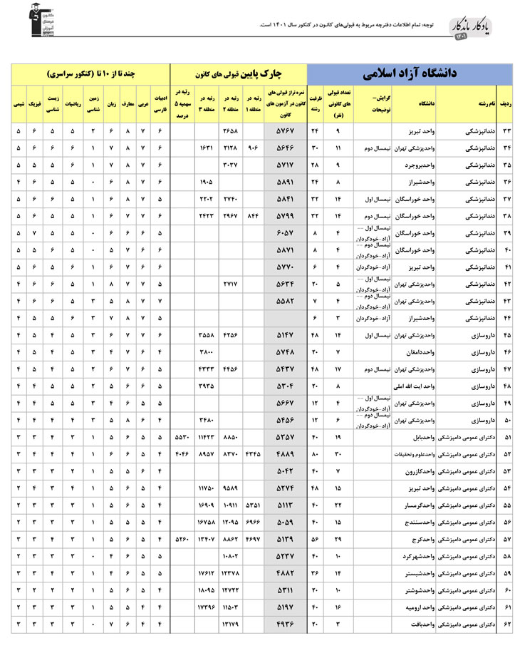 یادگار ماندگار : قبولی های کانونی دانشگاه آزاد در همه رشته ها در سال 1401 را در ادامه مشاهده کنید.فایل با کیفیت قبولی های سال 1401 را در قسمت فایل های ضمیمه دانلود کنید.
