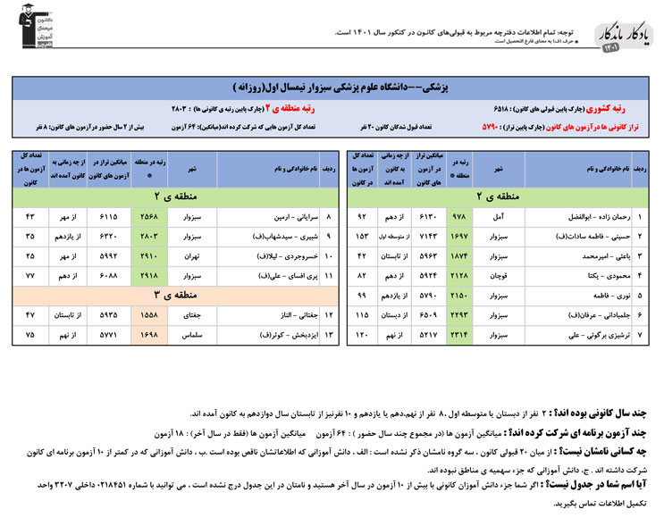 یادگار ماندگار : قبولی های کانونی دانشگاه علوم پزشکي سبزوار در همه رشته ها در سال 1401 را در ادامه مشاهده کنید.فایل با کیفیت قبولی های سال 1401 را در قسمت فایل های ضمیمه دانلود کنید.