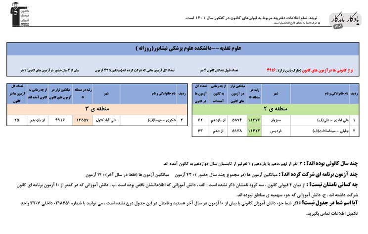 یادگار ماندگار : قبولی های کانونی دانشگاه علوم پزشکی نیشابور در همه رشته ها در سال 1401 را در ادامه مشاهده کنید.فایل با کیفیت قبولی های سال 1401 را در قسمت فایل های ضمیمه دانلود کنید.