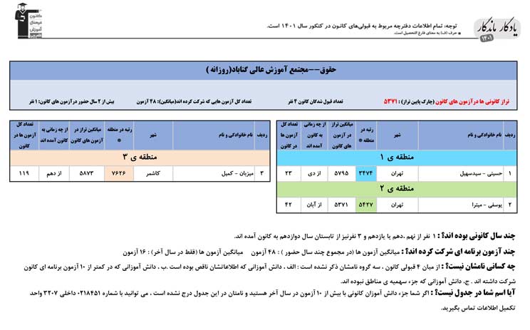 یادگار ماندگار : قبولی های کانونی مركز آموزش عالي گناباد در همه رشته ها در سال 1401 را در ادامه مشاهده کنید.فایل با کیفیت قبولی های سال 1401 را در قسمت فایل های ضمیمه دانلود کنید.