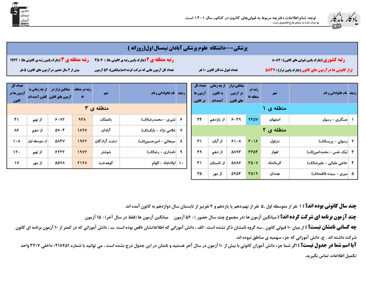 یادگار ماندگار : قبولی های کانونی دانشگاه علوم پزشکی آبادان در همه رشته ها در سال 1401 را در ادامه مشاهده کنید.فایل با کیفیت قبولی های سال 1401 را در قسمت فایل های ضمیمه دانلود کنید.