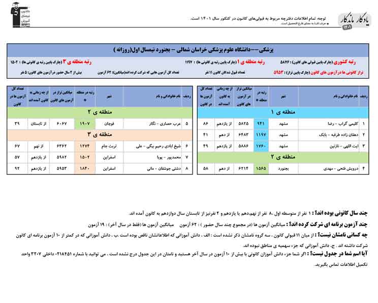 یادگار ماندگار : قبولی های کانونی دانشگاه علوم پزشکي خراسان شمالي - بجنورد در همه رشته ها در سال 1401 را در ادامه مشاهده کنید.فایل با کیفیت قبولی های سال 1401 را در قسمت فایل های ضمیمه دانلود کنید.