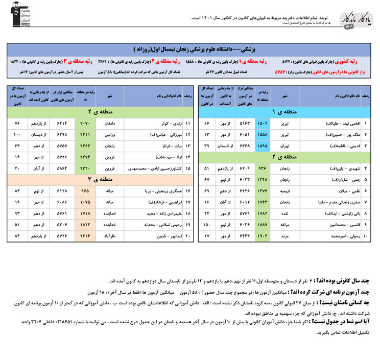 یادگار ماندگار : قبولی های کانونی دانشگاه علوم پزشکی زنجان در همه رشته ها در سال 1401 را در ادامه مشاهده کنید.فایل با کیفیت قبولی های سال 1401 را در قسمت فایل های ضمیمه دانلود کنید.