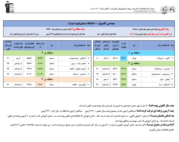 یادگار ماندگار : قبولی های کانونی دانشگاه سمنان در همه رشته ها در سال 1401 را در ادامه مشاهده کنید.فایل با کیفیت قبولی های سال 1401 را در قسمت فایل های ضمیمه دانلود کنید.