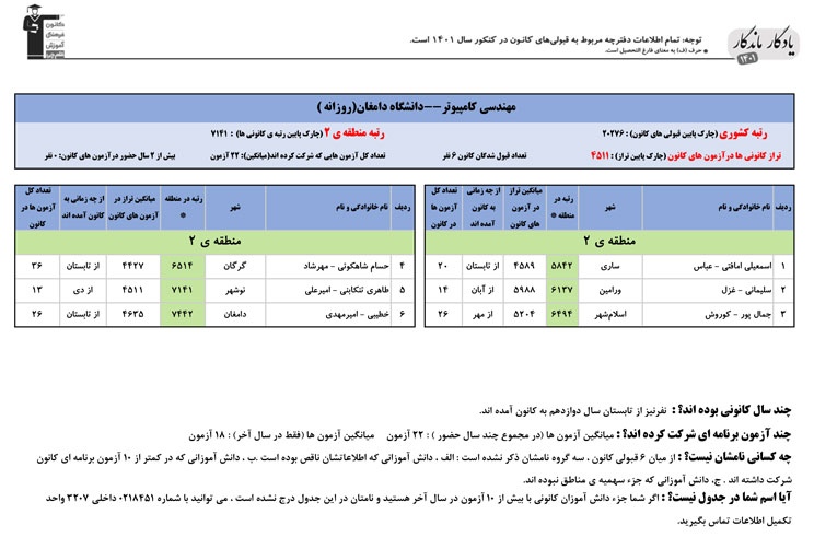 یادگار ماندگار : قبولی های کانونی دانشگاه دامغان در همه رشته ها در سال 1401 را در ادامه مشاهده کنید.فایل با کیفیت قبولی های سال 1401 را در قسمت فایل های ضمیمه دانلود کنید.