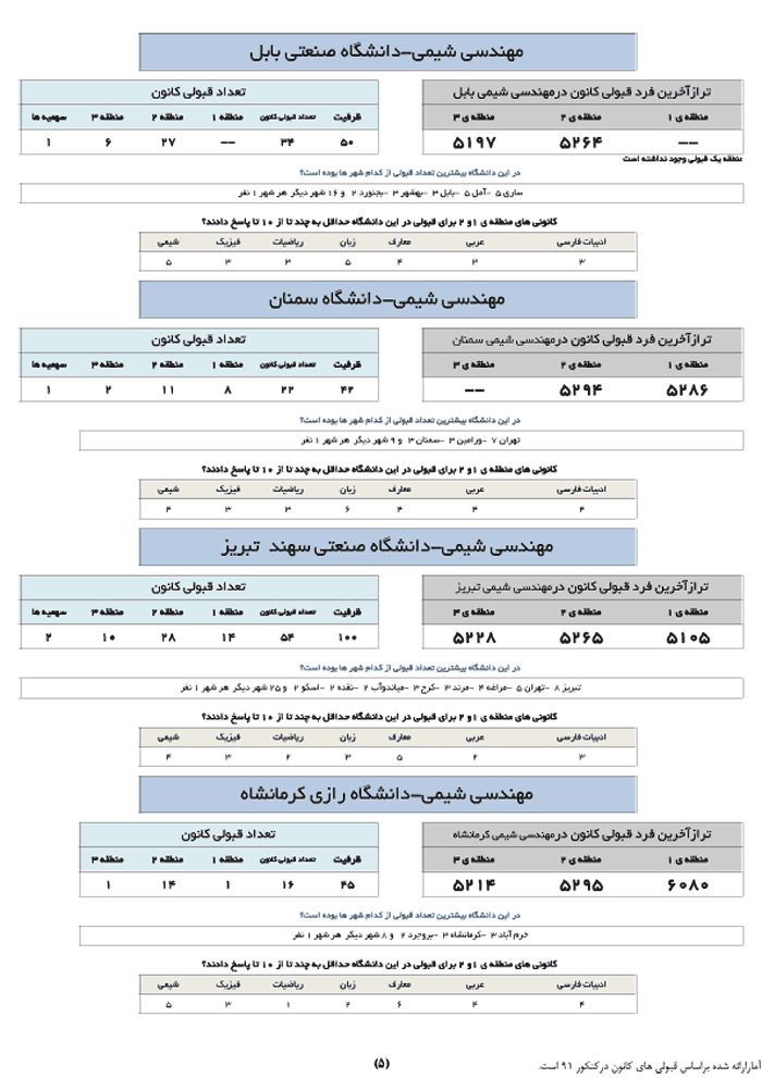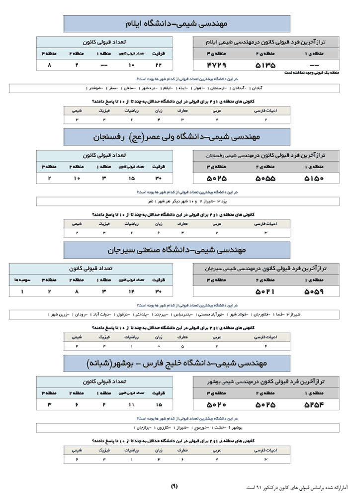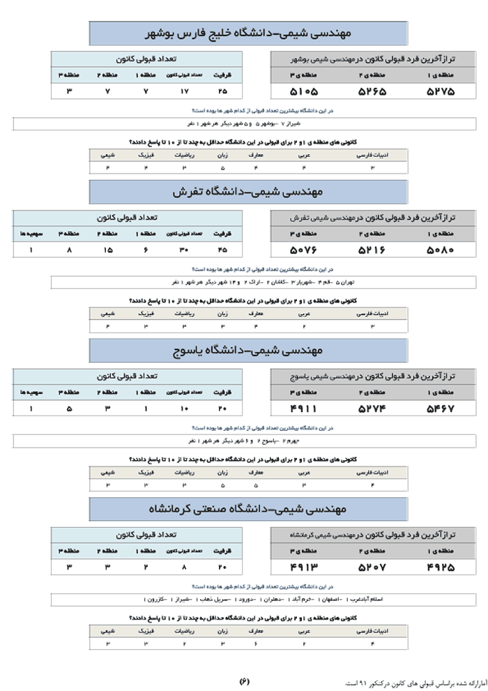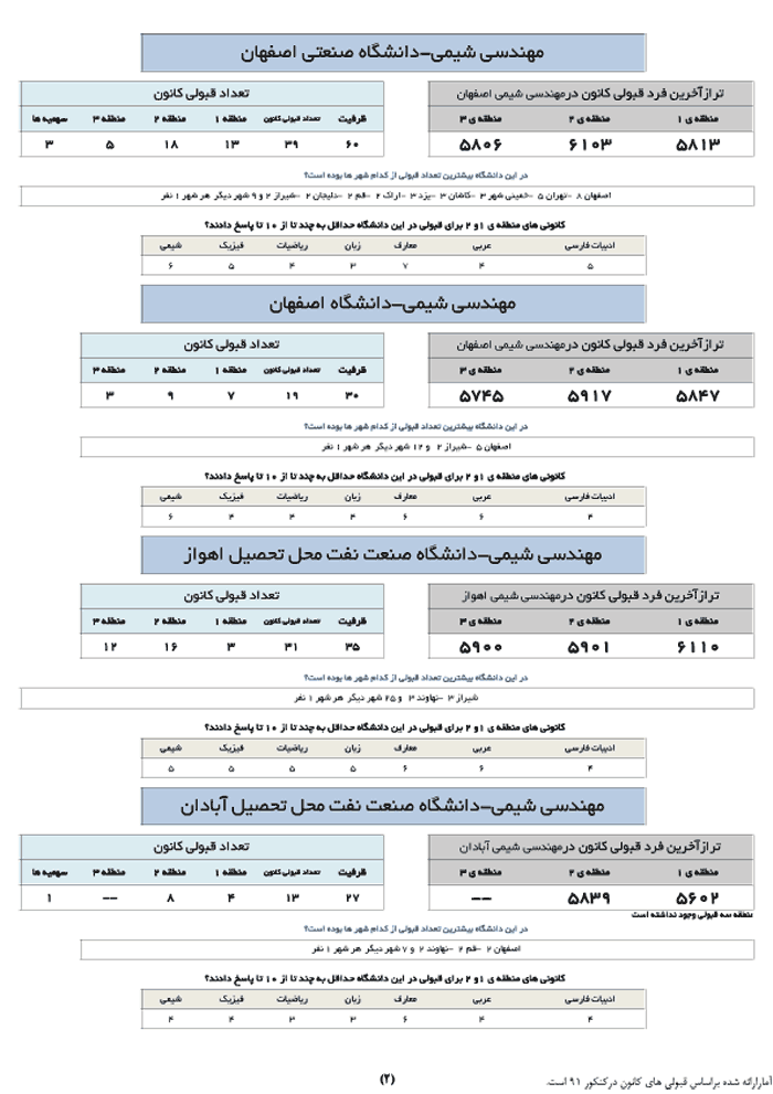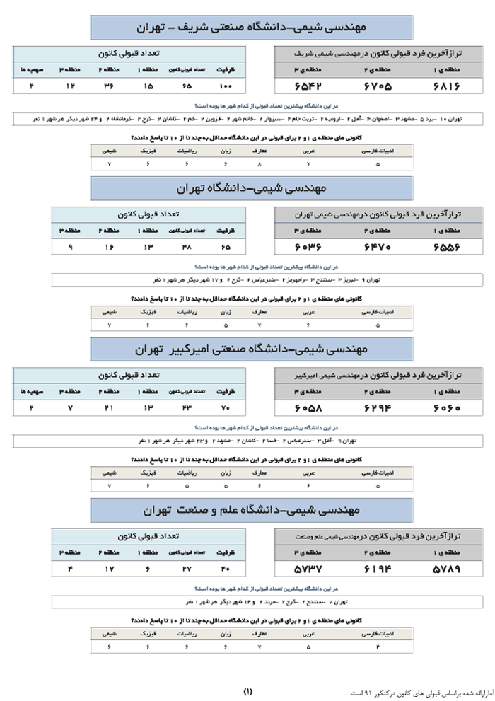 در جدول زیر تراز آخرین فرد قبول شده کانونی در رشته مهندسی شیمی در دانشگاه های مختلف ارائه شده است.