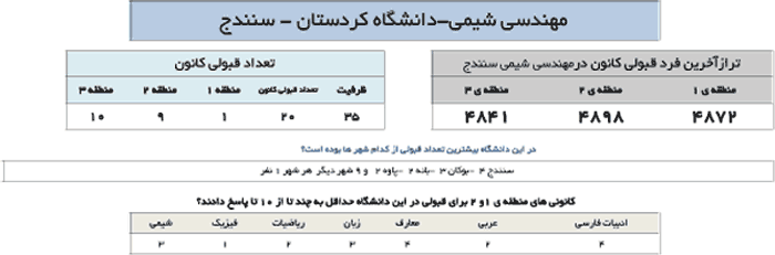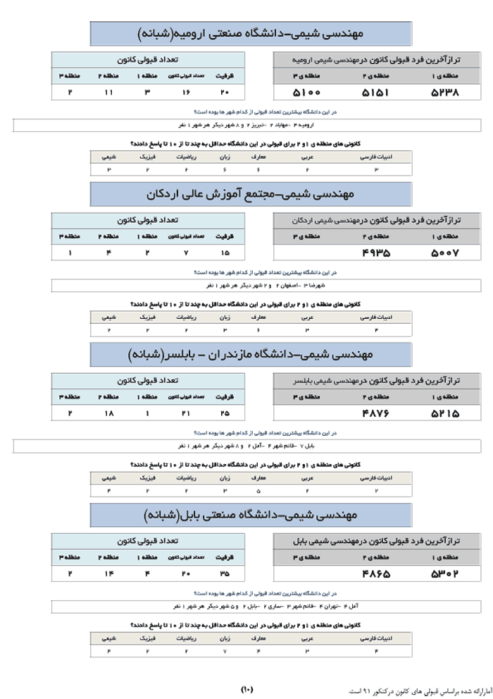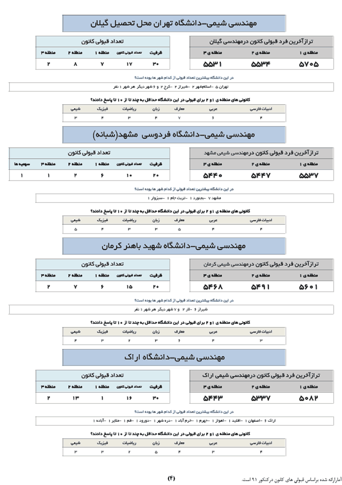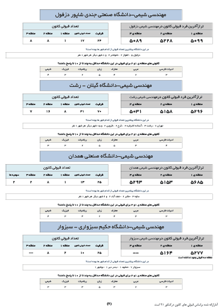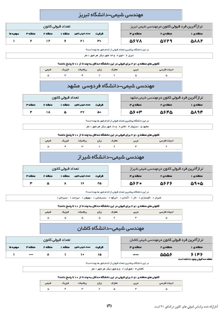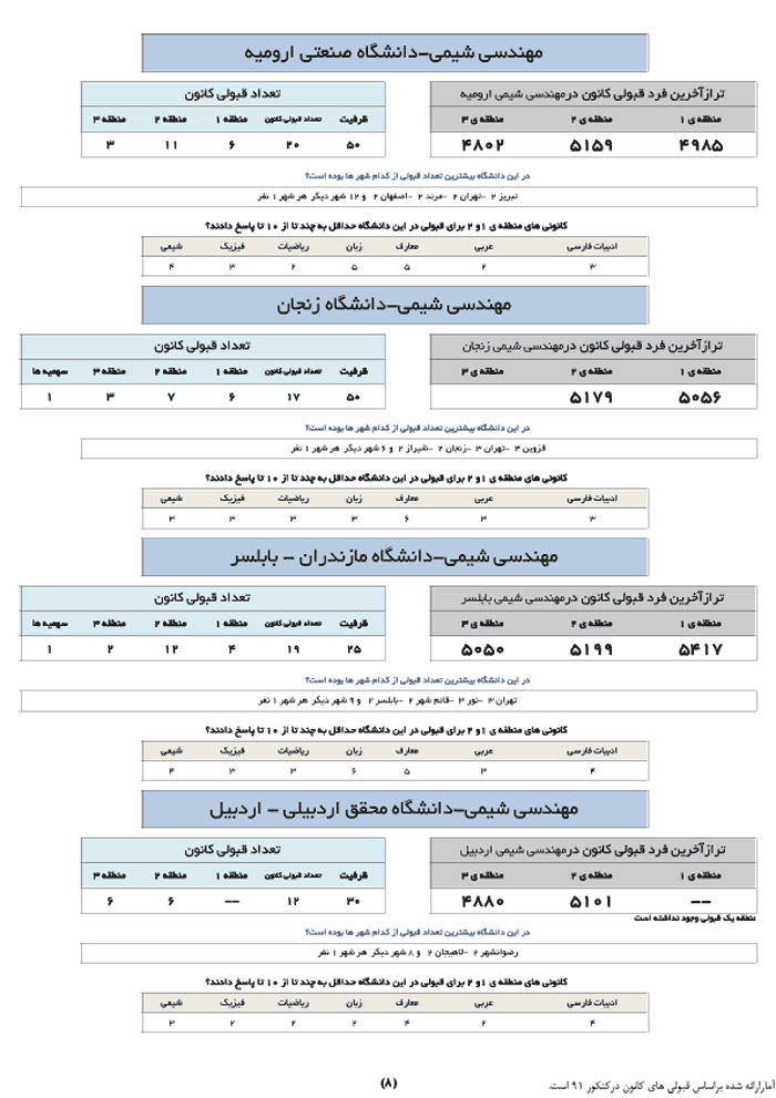 در جدول زیر تراز آخرین فرد قبول شده کانونی در رشته مهندسی شیمی در دانشگاه های مختلف ارائه شده است.