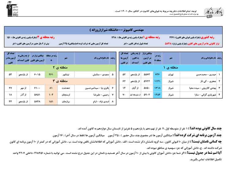 یادگار ماندگار : قبولی های کانونی دانشگاه شیراز را در همه رشته ها در سال 1401 را در ادامه مشاهده کنید.فایل با کیفیت قبولی های سال 1401 را در قسمت فایل های ضمیمه دانلود کنید.