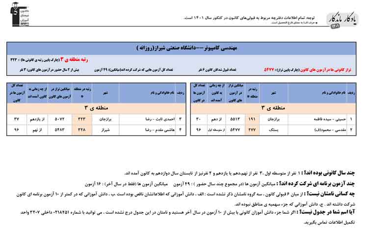 یادگار ماندگار : قبولی های کانونی دانشگاه صنعتی شیراز را در همه رشته ها در سال 1401 را در ادامه مشاهده کنید.فایل با کیفیت قبولی های سال 1401 را در قسمت فایل های ضمیمه دانلود کنید.