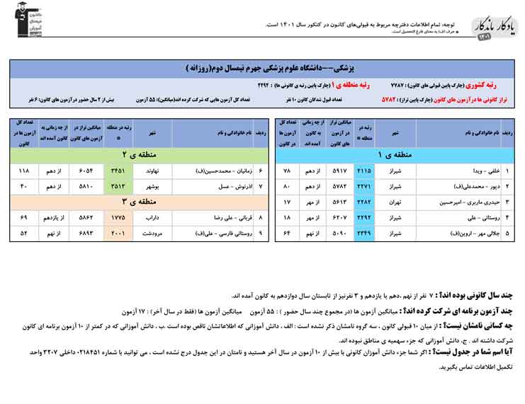 یادگار ماندگار : قبولی های کانونی دانشگاه علوم پزشکی جهرم در همه رشته ها در سال 1401 را در ادامه مشاهده کنید.فایل با کیفیت قبولی های سال 1401 را در قسمت فایل های ضمیمه دانلود کنید.