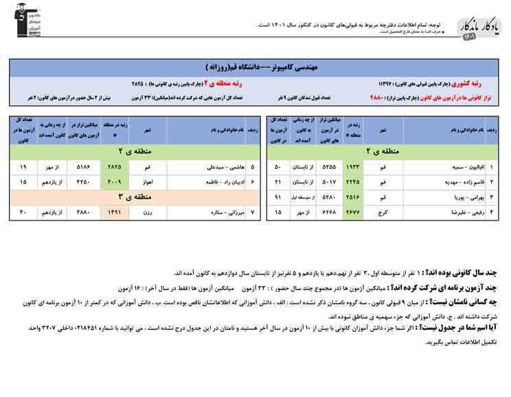 یادگار ماندگار : قبولی های کانونی دانشگاه قم در همه رشته ها در سال 1401 را در ادامه مشاهده کنید.فایل با کیفیت قبولی های سال 1401 را در قسمت فایل های ضمیمه دانلود کنید.