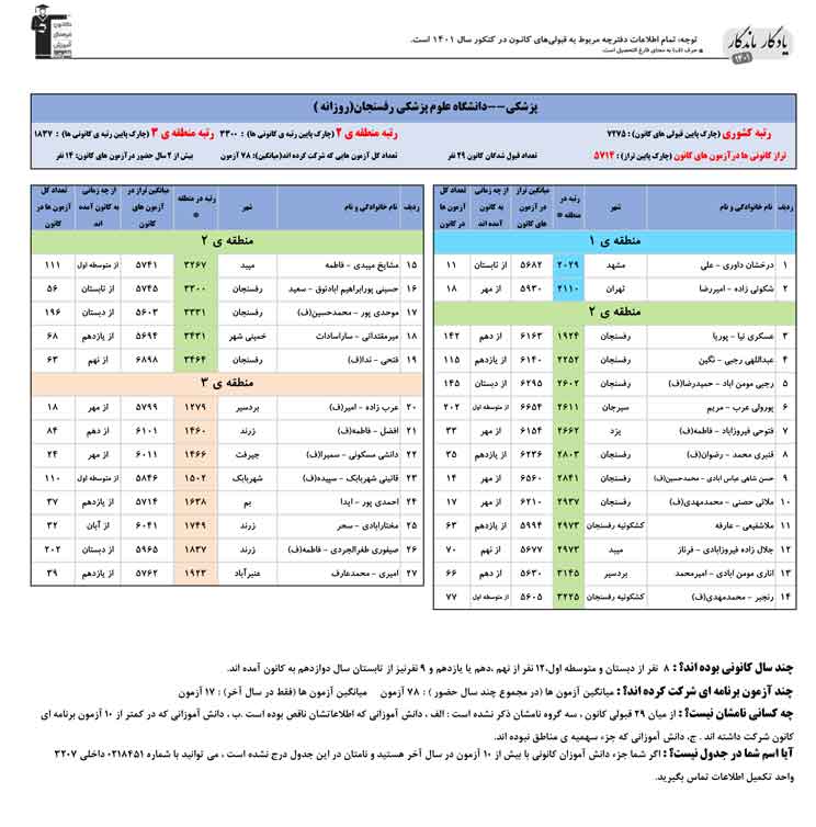 یادگار ماندگار : قبولی های کانونی دانشگاه علوم پزشکی رفسنجان در همه رشته ها در سال 1401 را در ادامه مشاهده کنید.فایل با کیفیت قبولی های سال 1401 را در قسمت فایل های ضمیمه دانلود کنید.