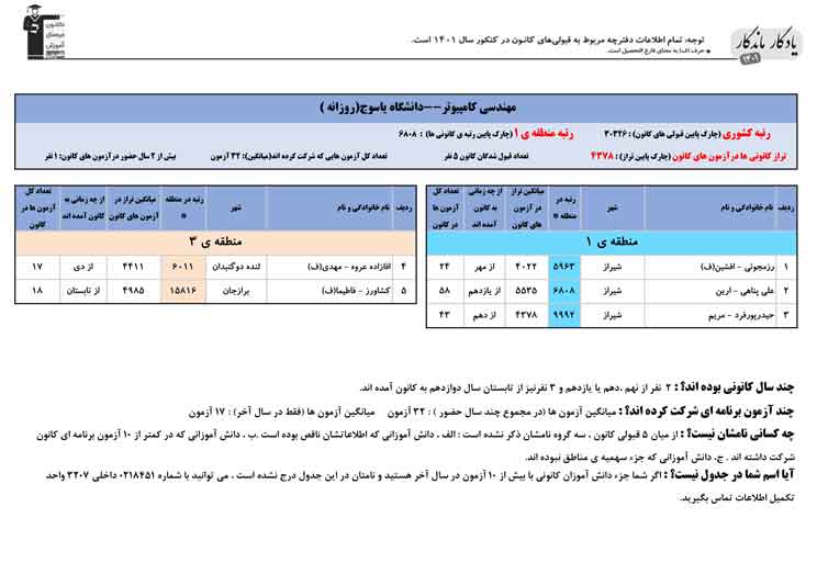 یادگار ماندگار : قبولی های کانونی دانشگاه یاسوج در همه رشته ها در سال 1401 را در ادامه مشاهده کنید.فایل با کیفیت قبولی های سال 1401 را در قسمت فایل های ضمیمه دانلود کنید.
