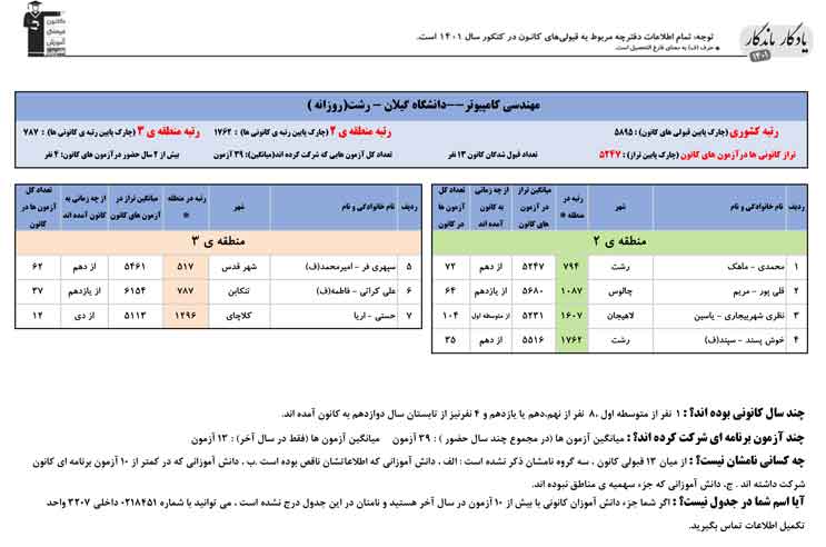 یادگار ماندگار : قبولی های کانونی دانشگاه گيلان - رشت در همه رشته ها در سال 1401 را در ادامه مشاهده کنید.فایل با کیفیت قبولی های سال 1401 را در قسمت فایل های ضمیمه دانلود کنید.