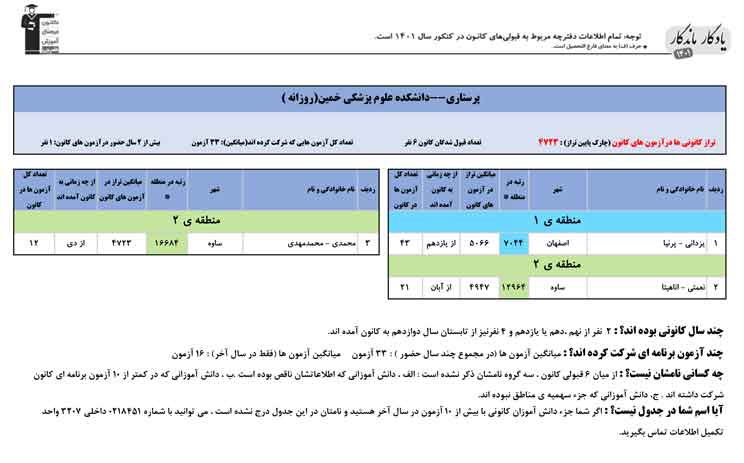 یادگار ماندگار : قبولی های کانونی دانشگاه علوم پزشکی خمین در همه رشته ها در سال 1401 را در ادامه مشاهده کنید.فایل با کیفیت قبولی های سال 1401 را در قسمت فایل های ضمیمه دانلود کنید.