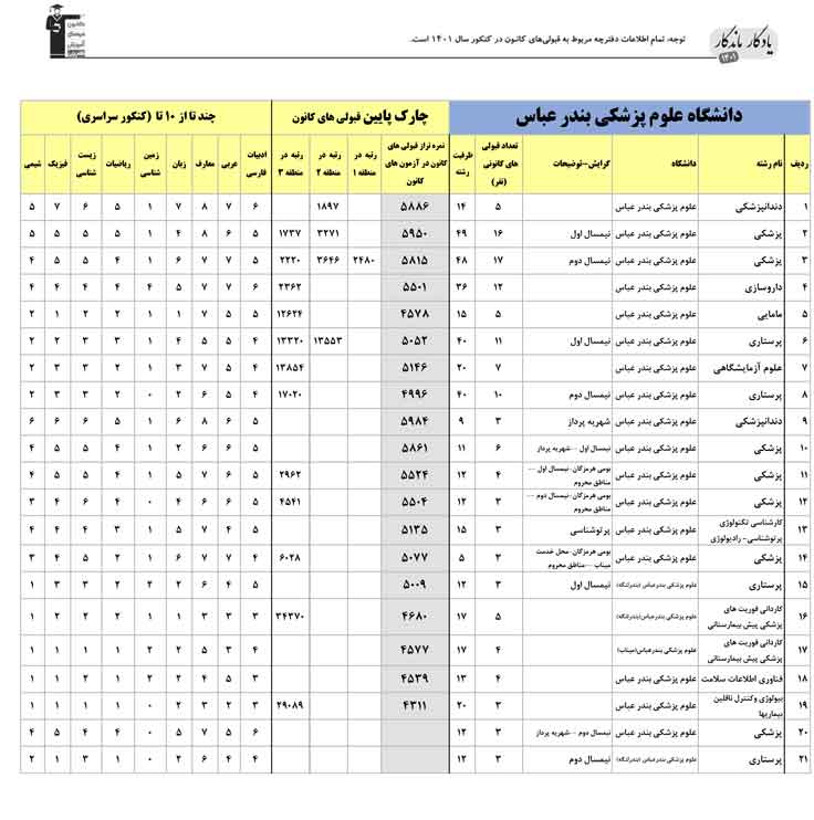 یادگار ماندگار : قبولی های کانونی دانشگاه علوم پزشکی هرمزگان - بندرعباس در همه رشته ها در سال 1401 را در ادامه مشاهده کنید.فایل با کیفیت قبولی های سال 1401 را در قسمت فایل های ضمیمه دانلود کنید.